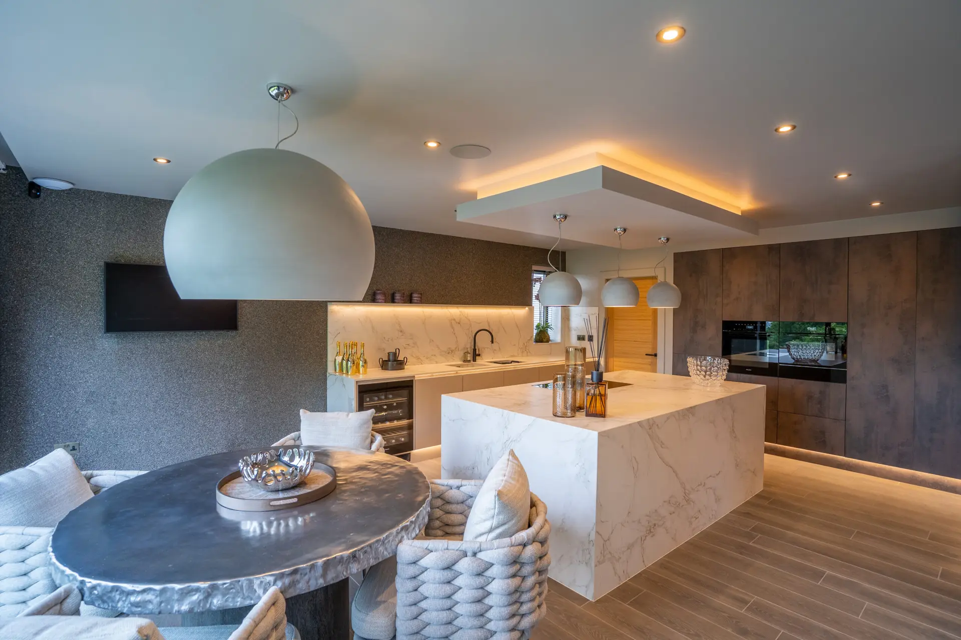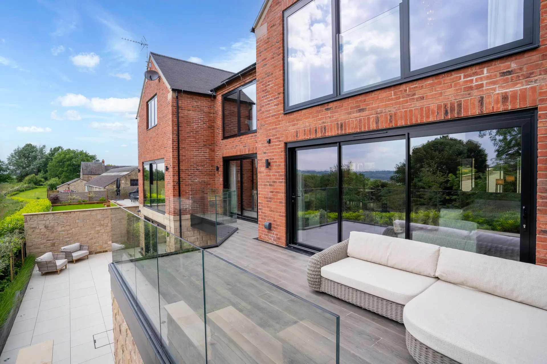 The property features; a basement bar and party room, open plan kitchen/diner, dual aspect lounge with a striking fireplace, three en-suite bedrooms with a vaulted master, open plan dressing room, double garage, sun terrace and a sunken courtyard to the rear.